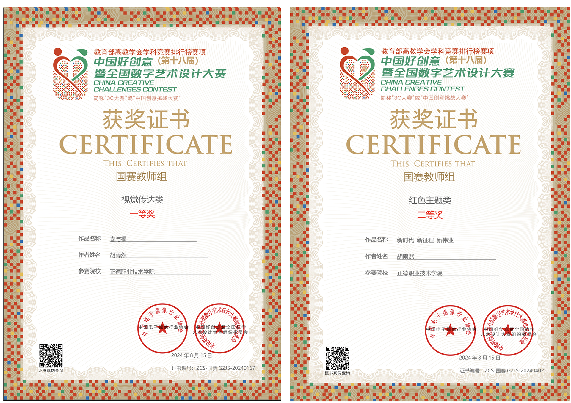 近日,第十八届中国好创意暨全国数字艺术设计大赛落下帷幕。艺术设计与建筑工程系师生荣获国家级一等奖1项、二等奖1项、三等奖2项,省级优秀奖1项,获奖数量创历史新高!胡雨然、王陶两位老师荣获了优秀指导教师奖。这一系列佳绩不仅彰显了我系在数字媒体技术领域的雄厚实力,也为学生和教师们的辛勤付出和才华展现画上了浓墨重彩的一笔。