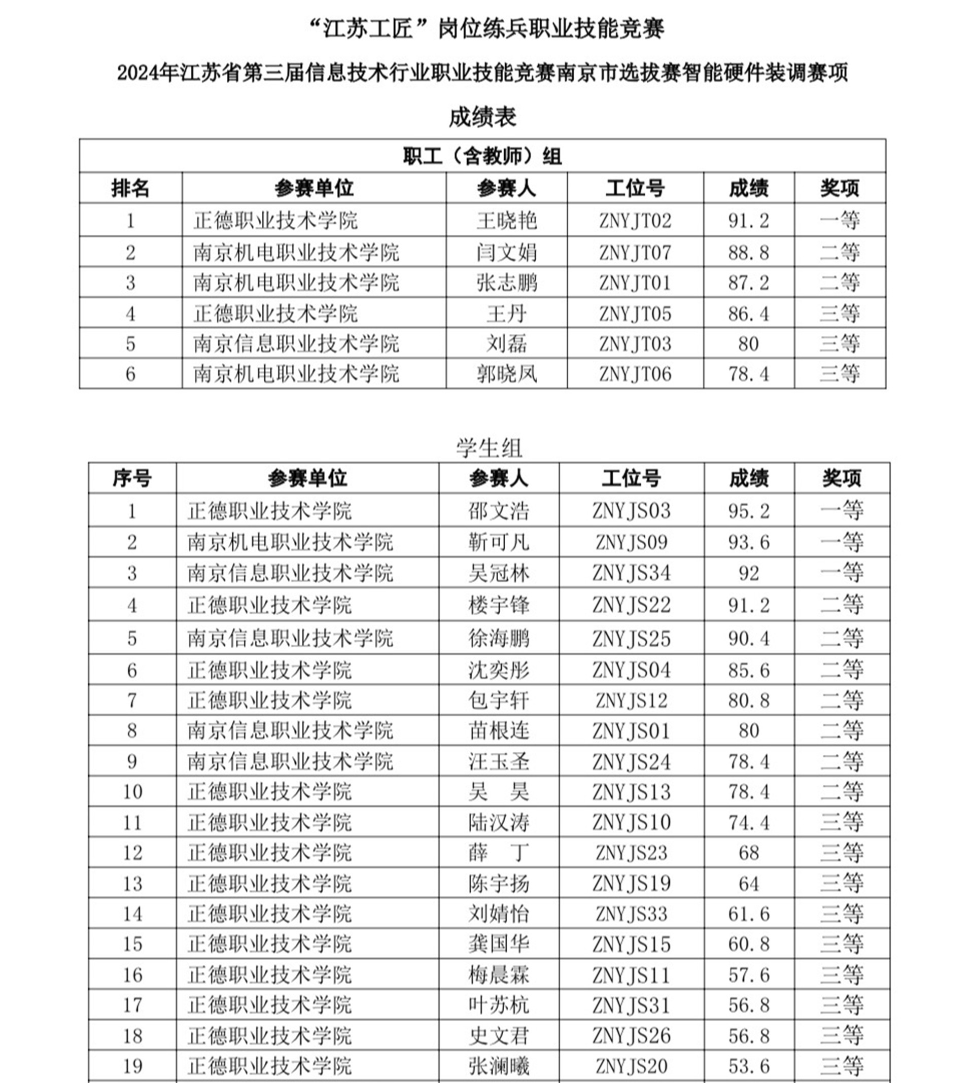 2024年10月13日,成人抖音 电子与信息技术系师生在南京工业职业技术大学参加了“江苏工匠”岗位练兵职业技能竞赛活动——2024年江苏省第三届信息技术行业职业技能竞赛南京市选拔赛。经过激烈角逐,成人抖音 代表队在智能硬件装调赛项中分别斩获教师组一等奖(第一名)1项、三等奖1项,学生组一等奖(第一名)1项、二等奖4项和三等奖9项。