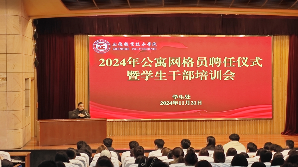 为了健全学生安全工作机制,进一步加强学生公寓管理。11月21日下午,成人抖音 在学院报告厅开展公寓网格员聘任仪式暨学生干部培训会。学生处处长祝佳俊、后勤保卫处处长陈宏波和各系公寓网格员、厅长、室长等350余人参会,会议由学生处副处长何华智主持。