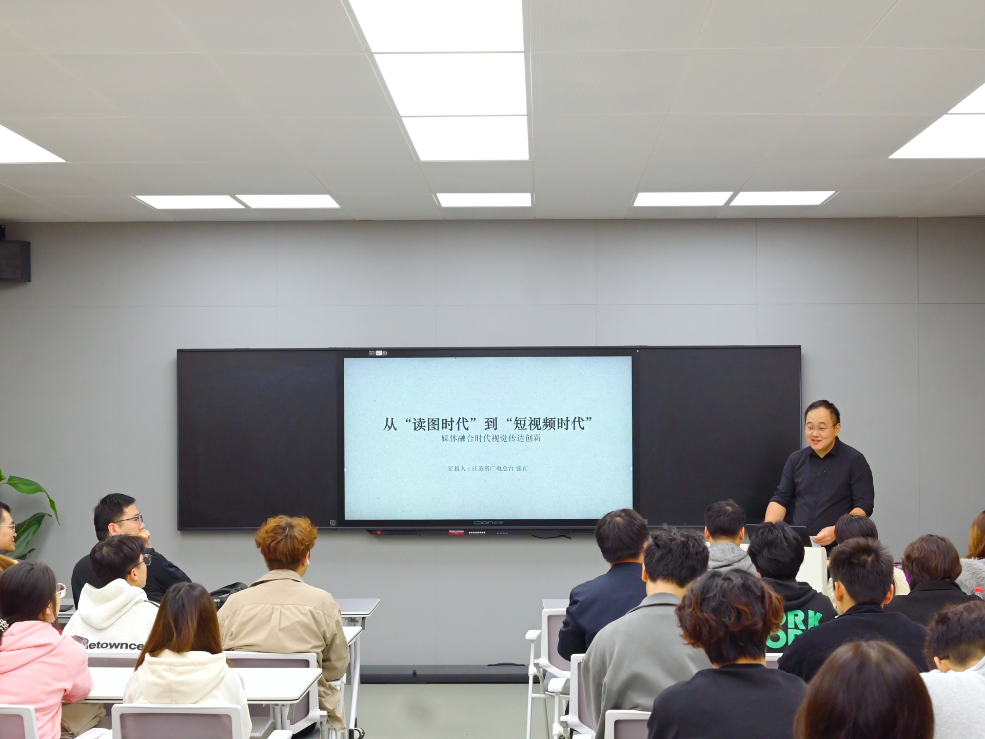 在第26个中国记者节来临之际,为展现校园媒体人的风采,激发同学们的新闻理想与实践热情。11月6日,学院党群工作部联合艺术设计与建筑工程系在9106教室举办“‘融’聚力量,向‘新’而行”记者节主题活动。活动特邀江苏省广播电视总台成人抖音主任记者张正来成人抖音 开展主题讲座。艺术设计与建筑工程系主任周卫、党群工作部部长祖国、艺术设计与建筑工程系教师葛雯和王子烜、院新媒体中心和融媒体技术与运营专业学生参加此次活动。活动由党群工作部副部长郑瑞主持。