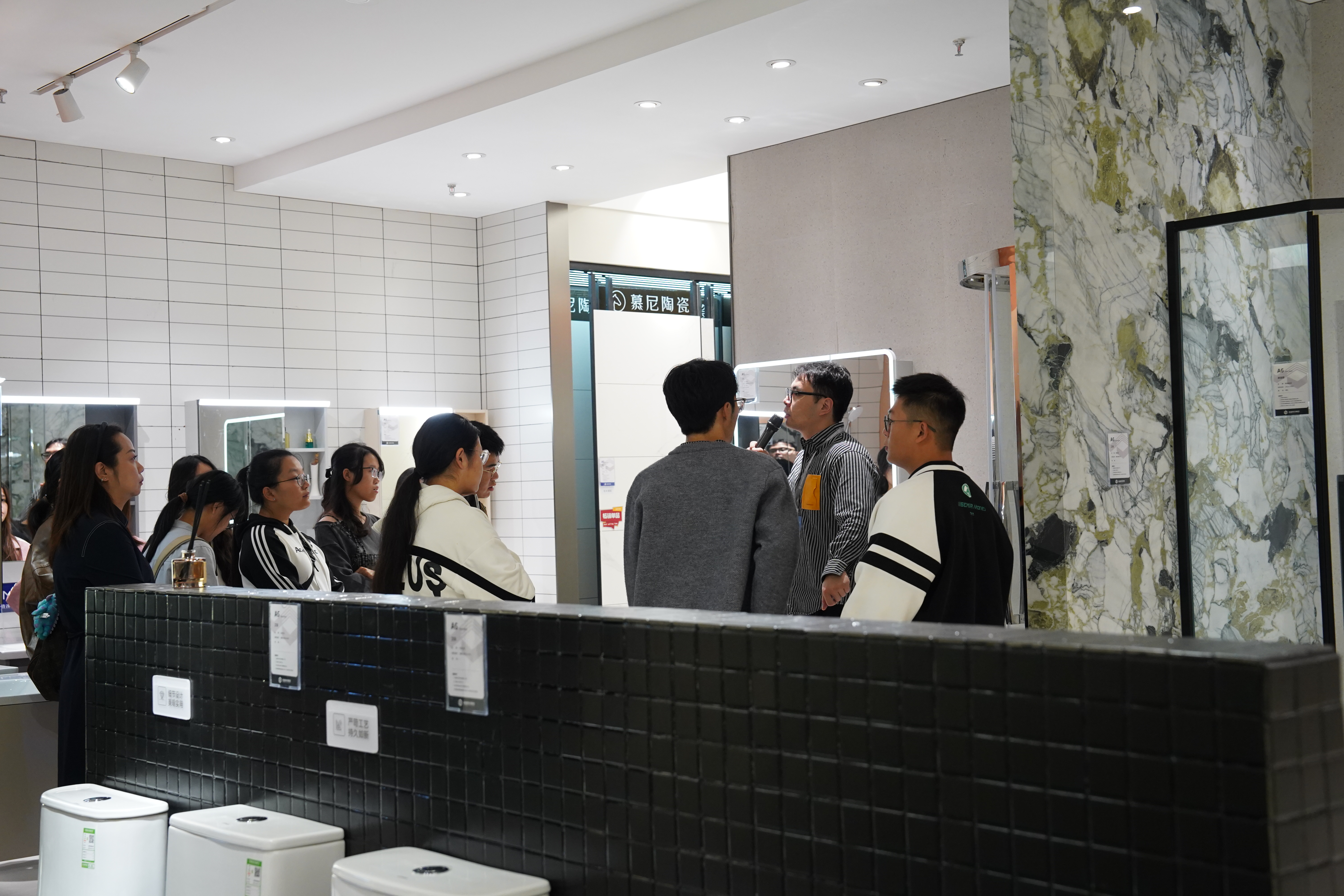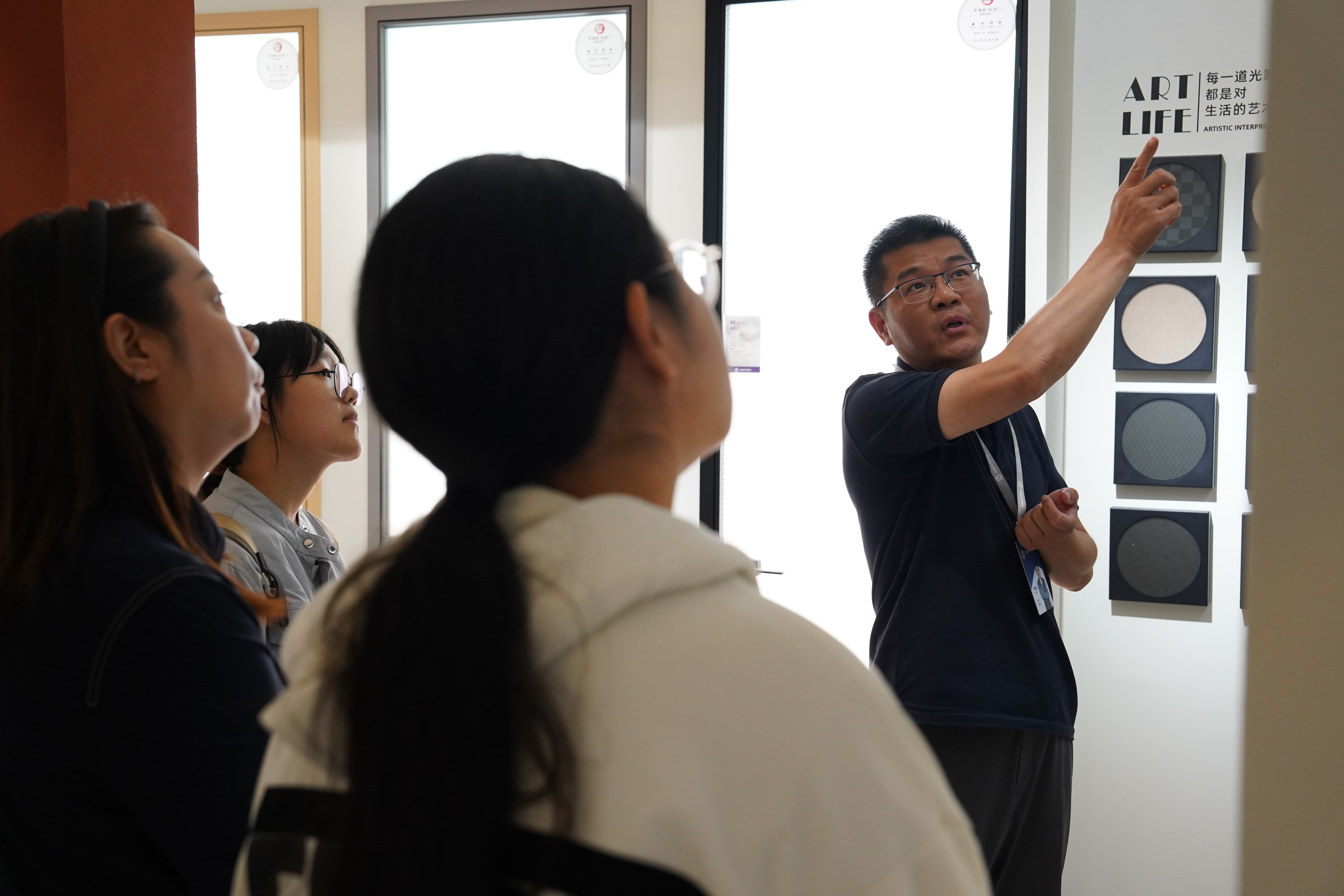 在铭望装饰经理饶苏天的引导下,同学们依次参观了公司的设计工作室、智能家居展示区以及全屋定制项目施工现场。从创意迸发的设计蓝图,到科技感十足的智能家居系统,再到严谨规范的施工一线,多维度、全流程的实地展示,让同学们对“全屋定制”与“智能家居”有了前所未有的直观认识,对建筑装饰行业的运营流程与关键环节建立了清晰的框架。