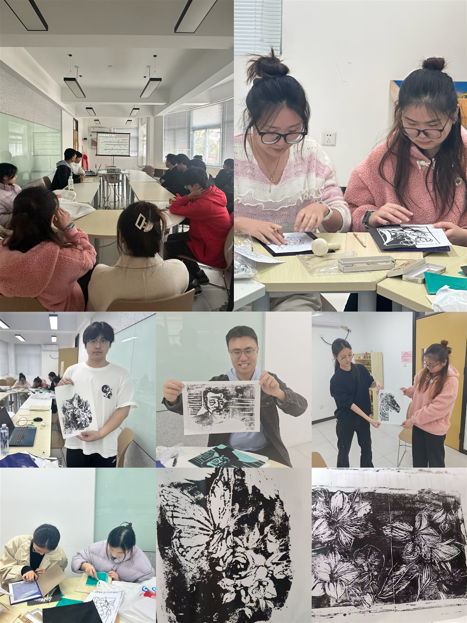活动伊始,2023级计算机应用技术培优班束程同学讲解木刻版画的历史渊源、创作形式与雕刻技法,并示范雕刻工具的安全使用方法。随后,同学们纷纷动手实践,他们在木板上雕刻图案,涵盖风景、动物、人物等多元主题,通过刀锋刻画赋予作品个性化艺术表达。雕刻完成后,学生将专用油墨均匀涂抹于版面,覆上宣纸进行印刷,完成从制版、上墨到印刷的全流程创作,将设计构思转化为实体作品。