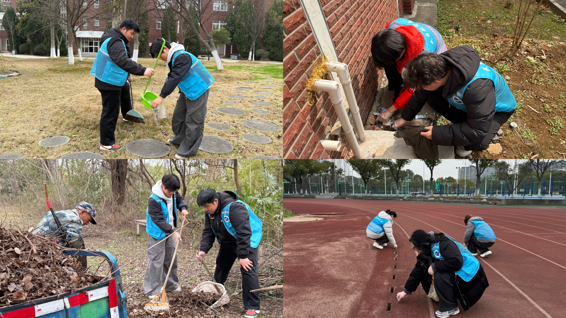 活动现场,身着蓝色志愿马甲的志愿者们热情高涨、分工明确,迅速投入到卫生整治工作中。大家手持垃圾钳、垃圾袋等工具,聚焦学院主干道、绿化带、卫生死角等重点区域,对散落的纸屑、烟头等垃圾进行全面清理。有的弯腰捡拾草丛中的白色垃圾,有的俯身清理砖缝里的杂物,有的将收集好的垃圾集中清运,忙碌的身影穿梭在学院的各个角落,形成了一道靓丽的“志愿蓝”风景线。