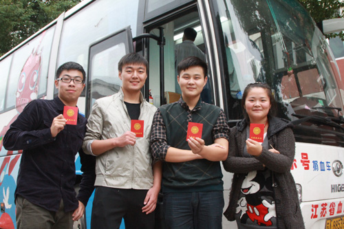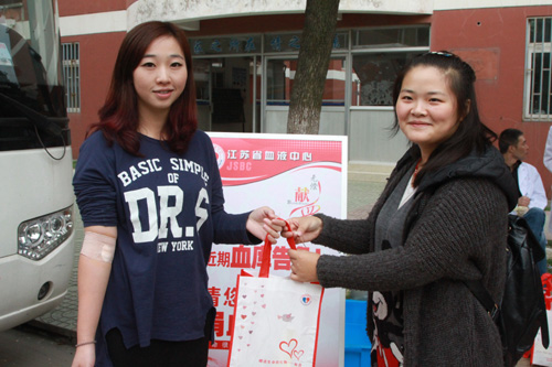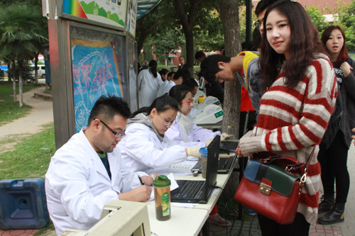 10月16日上午10点,江苏省血液中心三辆献血车在校园内刚刚在停好,就吸引了很多同学的围观和咨询。不一会儿,就见同学们自发地排起了长长的献血队伍,填表、量血压、验血型、献血、领取献血证,纵然过程繁琐,但现场秩序井然。