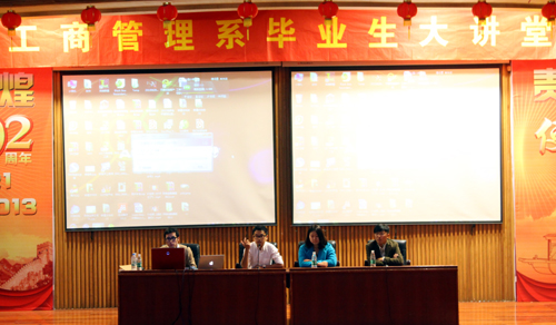 2014届毕业生即将走出校门迈入职场,在从“学生”向“职业人”角色的转换过程中,作为职场新人将面临各种压力和困惑,为了帮助毕业生增强对职业的适应性,为进入职业角色做好准备,11月11日,我系“毕业生大讲堂”系列活动邀请了金锋团队三名主创人员:成人抖音 工商管理系04级物流专业王浩同学、艺术系张晨同学跟他们的年轻老板蔡金锋先生,一同走进校园,在报告厅与360名同学共同分享了他们成长、创业、成功的故事。