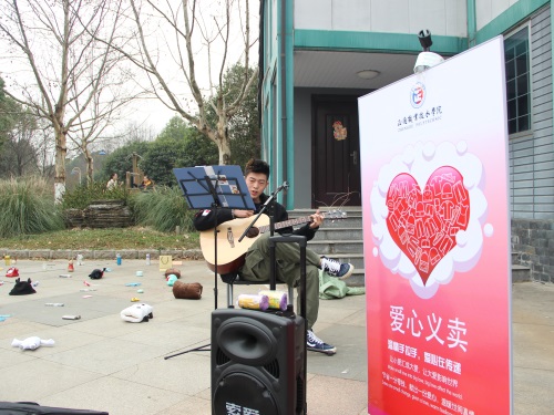 图二 义卖现场,志愿者献唱拉动人气