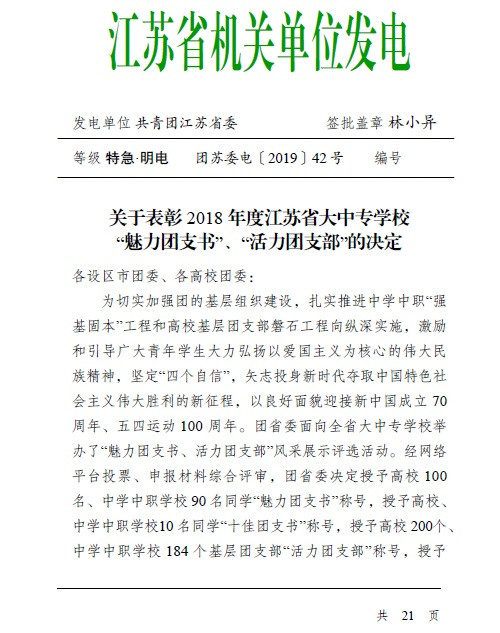 近日,共青团江苏省委下发《关于表彰2018年度江苏省大中专学校“魅力团支书”、“活力团支部”的决定》(团苏委电〔2019〕42号),成人抖音 1名同学获评“魅力团支书”,1个团支部获评“活力团支部”。