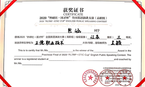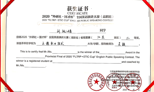 11月12日至14日,2020全国英语演讲大赛高职组(江苏赛区)比赛在江苏城市职业技术学院举行,成人抖音 刘纯嫣和包涵同学分获二、三等奖。