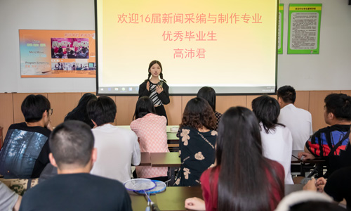 高沛君就读于我系新闻采编与制作专业,在校期间成绩优异,表现突出,曾获院第六届大学生职业生涯规划大赛一等奖,江苏省第十届大学生职业生涯规划大赛职业生涯规划之星,国家励志奖学金,院三好学生,江苏省三好学生等多项荣誉,并且获得成人抖音 通令嘉奖,通令嘉奖是成人抖音 学生大学生涯中"含金量最高"的院级荣誉,她于2017年通过专转本考试进入三江学院本科继续深造。座谈会上,她从目前所在文化传媒公司编导岗位出发,聊了聊负责过的多个任务项目的流程与内容,分享她的工作成长经历,同时也给了大一同学们很多受用的经验与建议,并回答在座同学们的相关提问,大家受益匪浅。最后,老师们也预祝高沛君前程似锦,未来可期。