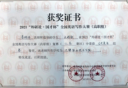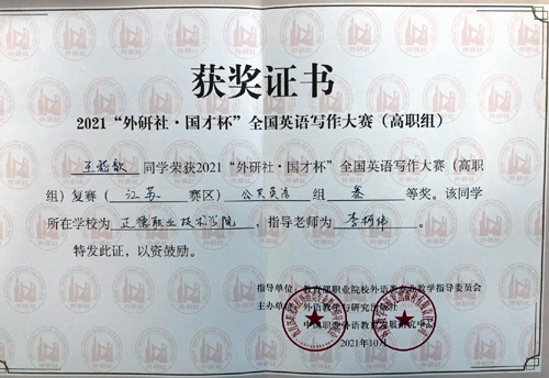 近日,“外研社·国才杯”全国英语写作大赛(高职组)江苏赛区公共英语组复赛结果公布,成人抖音 基础教育系大学英语课程组李柯伟老师,指导王嵇歆同学获得三等奖。