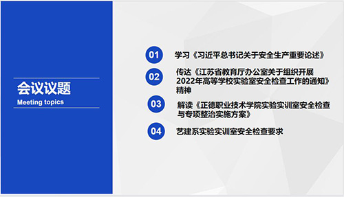 会议分为四部分议题,大家学习《习近平总书记关于安全生产的重要论述》,了解《江苏省教育厅办公室关于组织开展2022年高等学校实验室安全检查工作的通知》中提出的工作要求,谢岚主任为大家解读了《成人抖音-成人抖音app-成人抖音下载 实验实训室安全检查与专项整治实施方案》,并提出在本系实验实训室安全管理工作中要达到的各项要求。