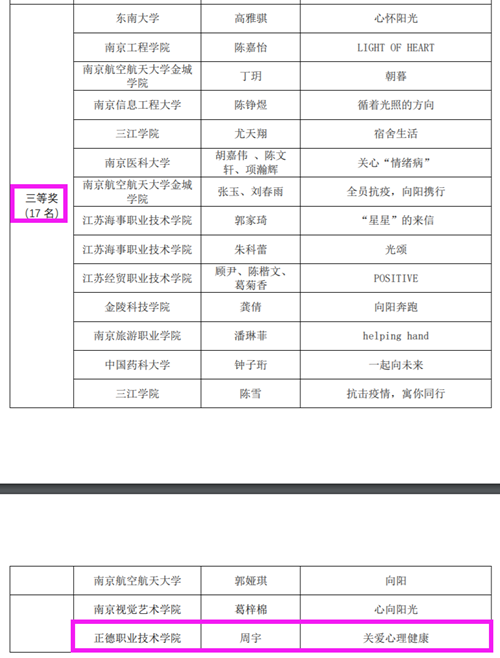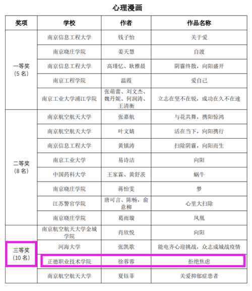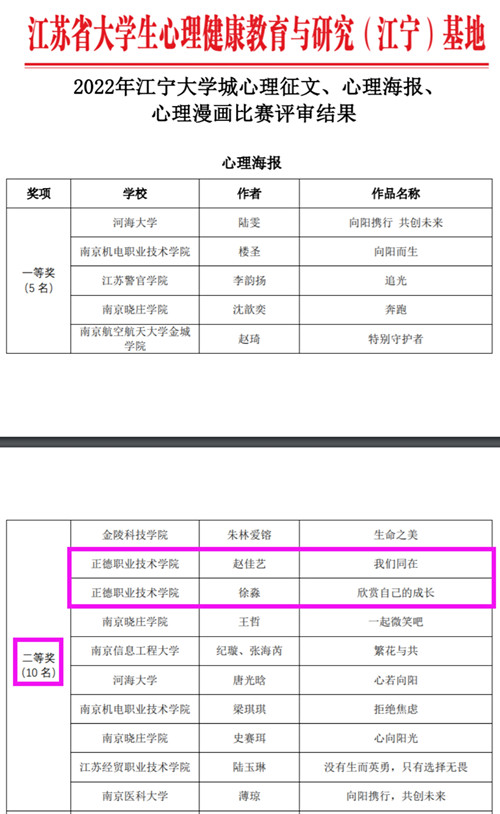 今年南京各高校参与热情高涨,创作激情迸发。成人抖音 学生处大学生心理健康教育中心联合各系积极宣传、广泛发动、深入挖掘有潜力的学生参与。经过努力,最终喜获二等奖2项、三等奖2项,本次比赛本科专科是同一个“赛道”,同类院校中成人抖音 是唯一一所荣获2项二等奖的高校,成绩的取得得益于长期以来学院领导高度重视大学生心理健康教育工作。